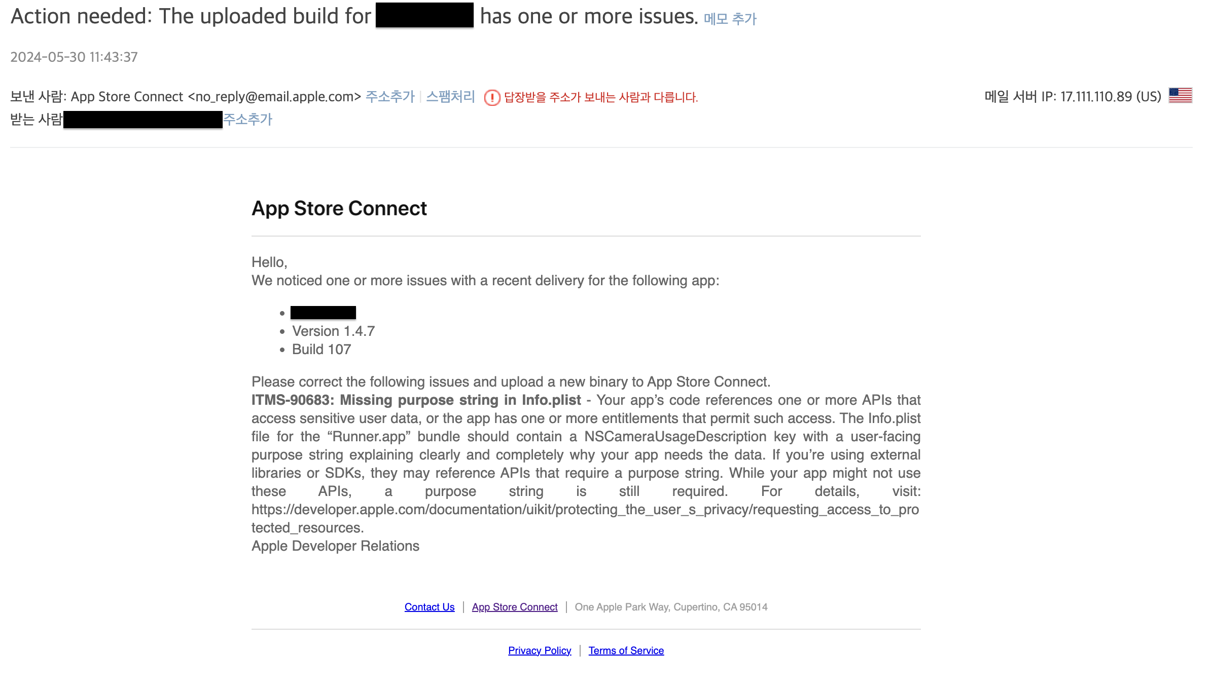 Xcode로 빌드는 잘 되었다. 하지만 distribute 도중 실패하며, "은 유효한 바이너리가 아닙니다"라는 알림창이 뜬다. 메시지는 구체적이지 않지만, 해결방법은 있다. 우선 메일함을 열어보자.애플에서 메일을 한통 어떻게 하라는지 친절하게 알려준다.Flutter의 특정 라이브러리가 카메라를 사용하기에 발생한 증상으로 보인다.나 같은 경우 당장 카메라 엑세스가 필요하지 않은데, 이런 경우 라이브러리를 직접 수정해야 하는 건가 의문이 남기에, 나중에 알아봐야겠다.